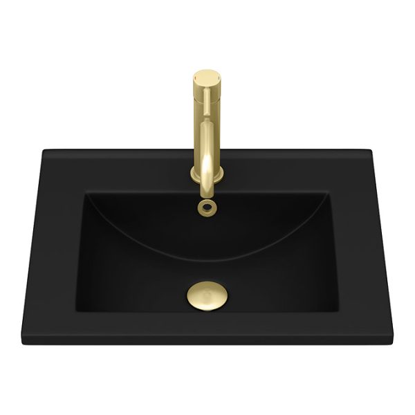 - Matt black slimline ceramic basin with an 18mm profile and matching brushed brass overflow