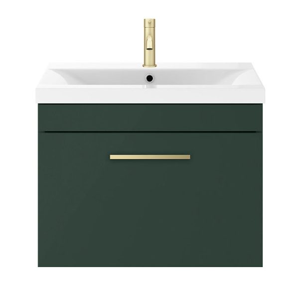 Arezzo 600 Matt Dark Green Wall Hung 1-Drawer Vanity Unit with Ceramic Mid-Edged Basin + Brushed Brass Handle