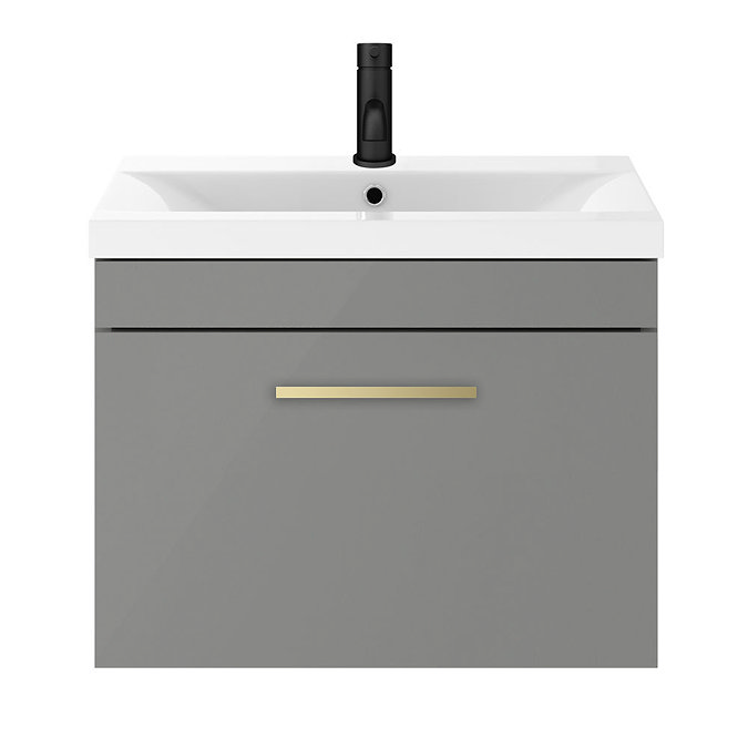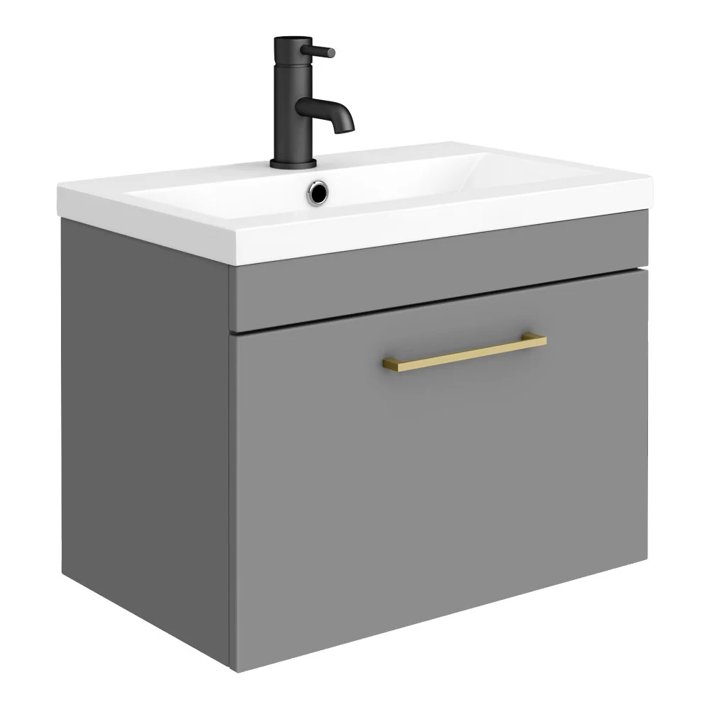 Arezzo 600 Matt Grey Wall Hung 1-Drawer Vanity Unit with Ceramic Mid-Edged Basin + Brushed Brass Handle