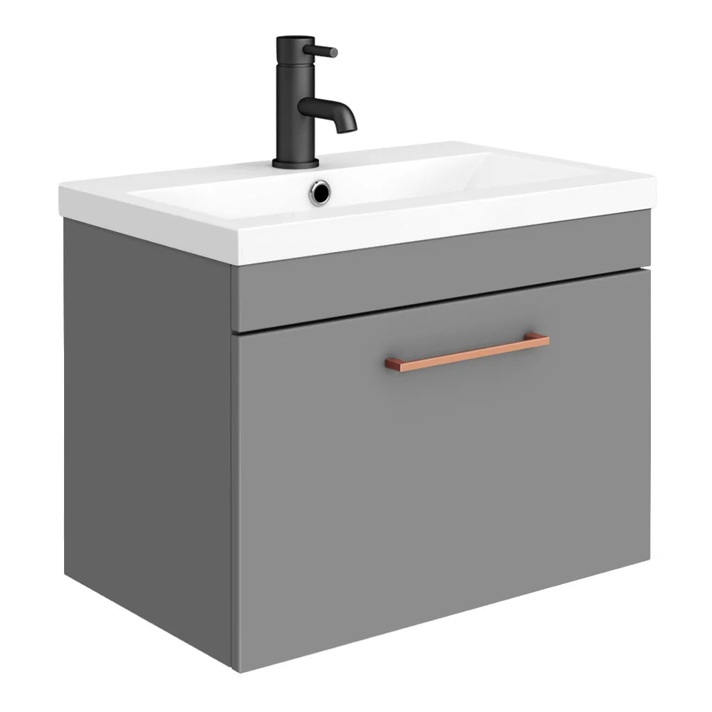 Arezzo 600 Matt Grey Wall Hung 1-Drawer Vanity Unit with Ceramic Mid-Edged Basin + Polished Rose Gold Handle