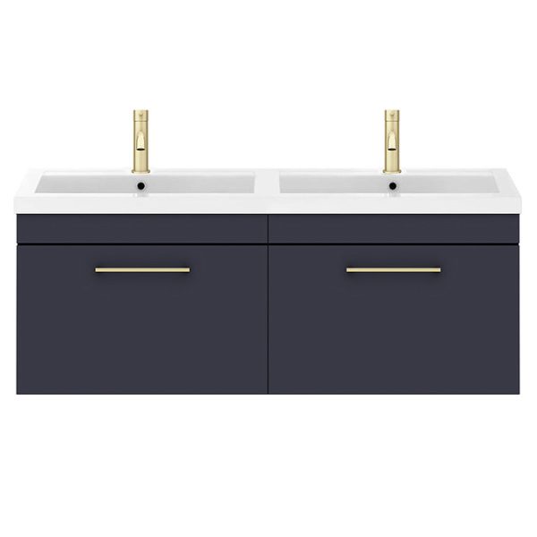 Arezzo 1205 Matt Blue Wall Hung Double Basin Vanity Unit with Brushed Brass Handles (2-Drawers)