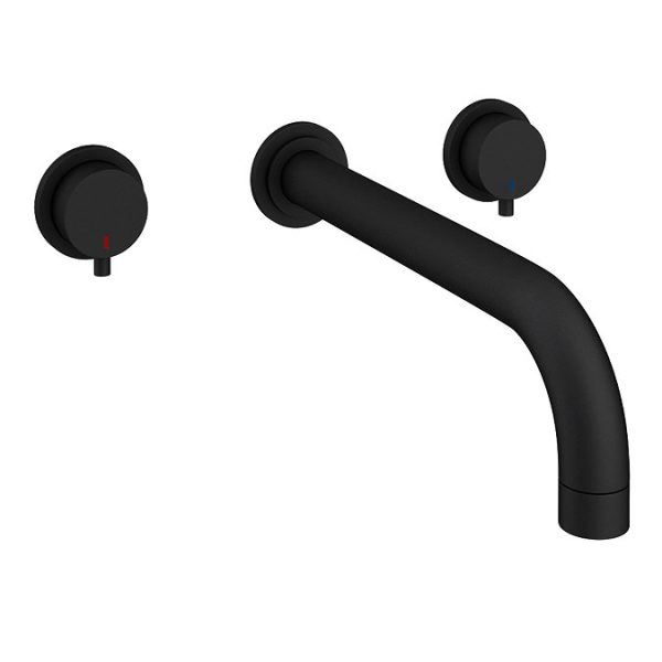 Add a splash of modernist style to your bathroom with this premium quality Arezzo Round Wall Mounted Bath Filler Tap. Characterized by a gentle downward curve, the spout is smooth to the touch and boasts matching circular lever tap heads that control water flow and temperature. Expertly manufactured from hardwearing brass, this designer bath filler tap effortlessly withstands the rigours of daily use. A black matt finish creates a sleek look for a striking contrast against traditional white fixtures and fittings.