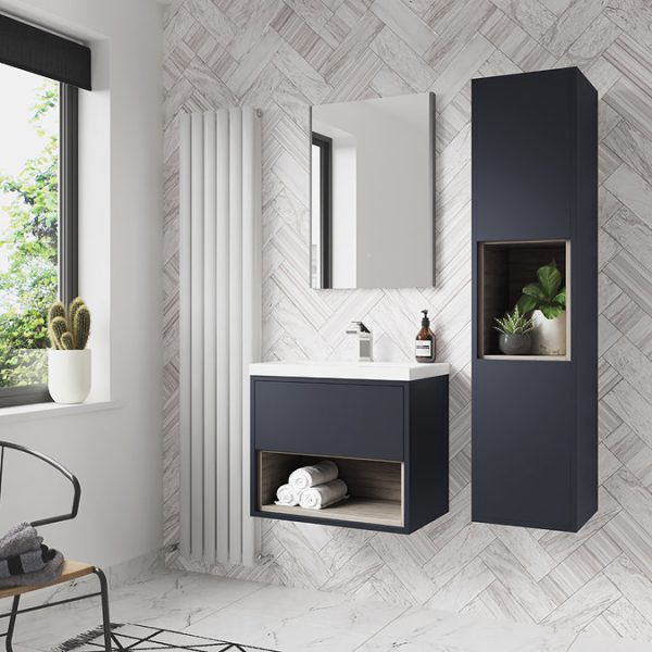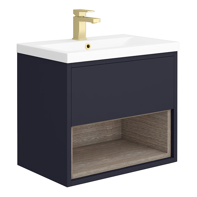 Arezzo Senza 600mm Matt Blue / Grey Vicenza Oak 1 Drawer Wall Hung Vanity Unit with Open Shelf + Mid-Edge Ceramic Basin