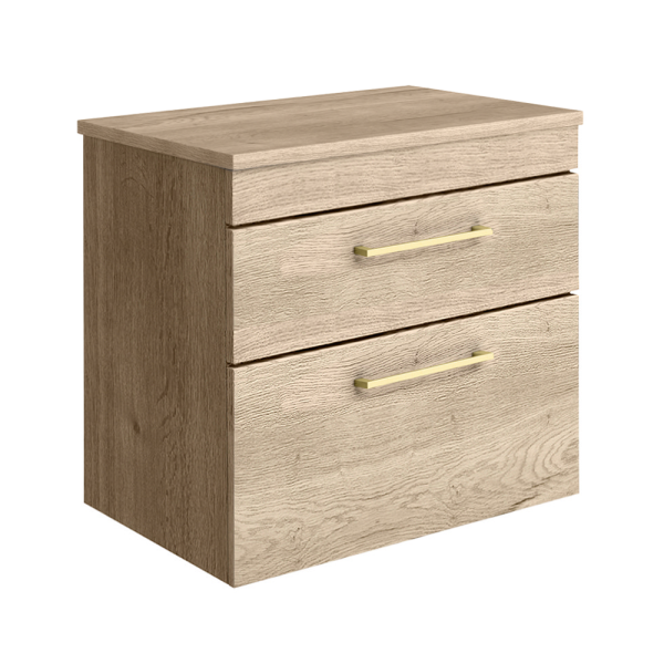 Arezzo 600 Rustic Oak Wall Hung 2-Drawer Vanity Unit with Worktop + Brushed Brass Handles