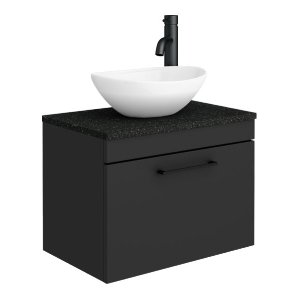 Arezzo 600 Matt Black Wall Hung 1-Drawer Vanity Unit with Sparkling Black Quartz Effect Worktop, Matt Black Handle and Gloss White Oval Countertop Basin