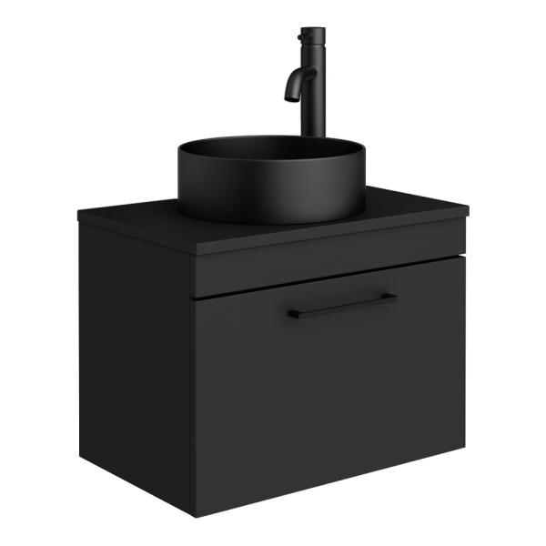 Arezzo 600 Matt Black Wall Hung 1-Drawer Vanity Unit with Worktop, Matt Black Handle and Matt Black Round Countertop Basin