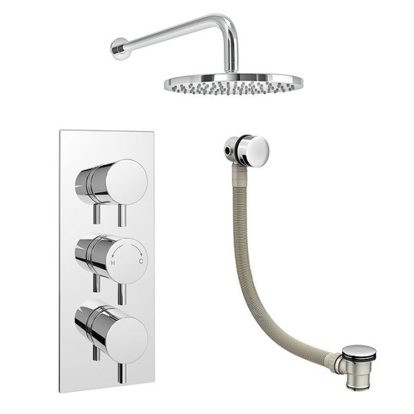 The minimalist Cruze shower system features a triple concealed thermostatic shower valve with stylish round handles, wall mounted shower head and overflow bath filler click clack waste brings substantial elegance to the modern bathroom. This stylish concealed thermostatic shower system offers thermostatic showering via three easy-to-operate controls. Separate controls for temperature and flow. Operates two outlets separately or simultaneously. (fixed head and overflow bath filler)