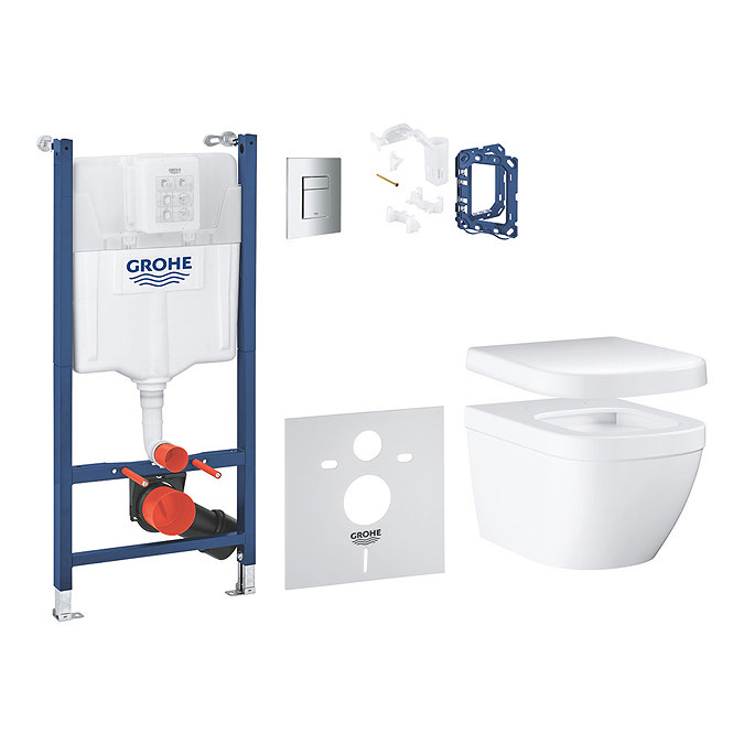 Grohe Solido Euro Ceramic Rimless Wall Hung Toilet with Skate Cosmopolitan Flush Plate, Concealed Cistern + Frame (6 in 1 Bundle)