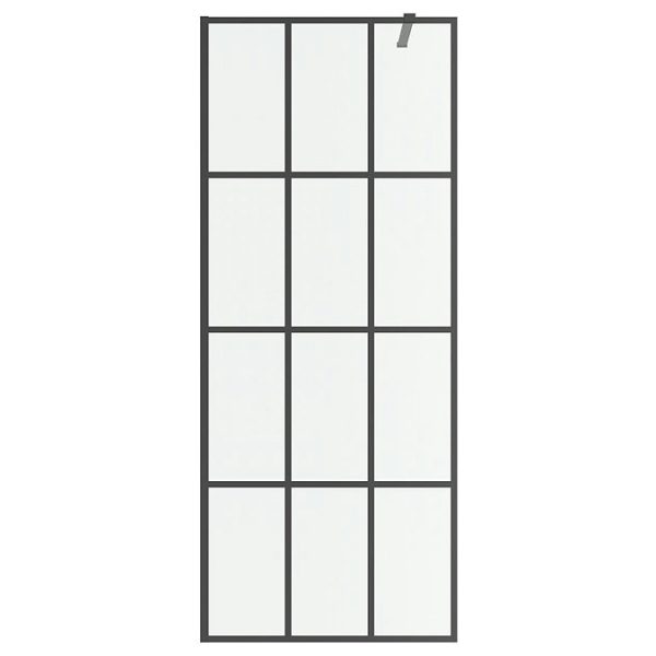 The panel features a sleek black framed pattern, screen-printed for a smooth, easy-to-clean surface. The contemporary black aluminium profiles and stainless steel support bar, finished in matt black, enhance its sophisticated design.