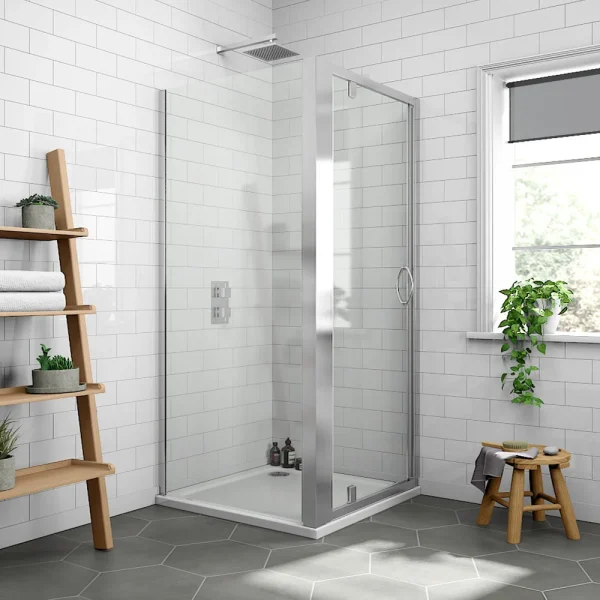 Newark 900 x 900mm Pivot Door Shower Enclosure + Pearlstone Tray