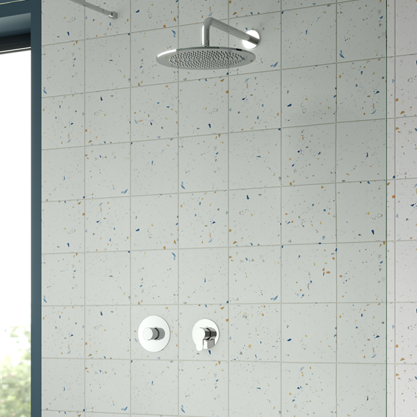 The Nuie concealed thermostatic shower bundle is a premium package, finished in sleek chrome for a modern look. This bundle features a flexible design for independent outlet positioning, a precise thermostatic temperature control valve, a concealed stop tap for effortless operation, a stylish wall-mounted shower arm, and a fixed shower head. Together, these elements provide a sophisticated and complete showering solution that enhances both functionality and aesthetics in any bathroom.