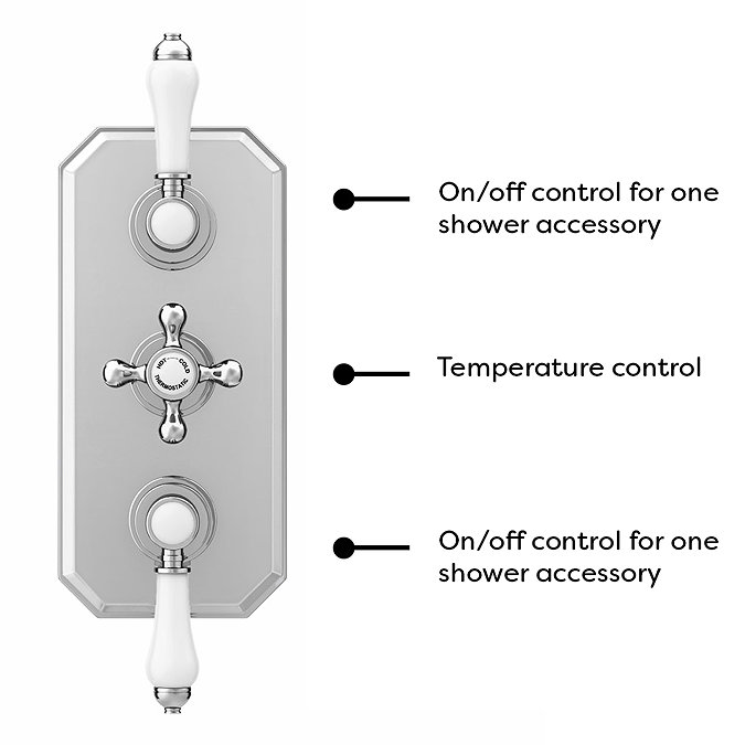 The traditional Trafalgar shower system features a triple concealed thermostatic shower valve with classic crosshead/lever handles, a wall-mounted 8″ shower head, and an overflow bath filler click clack waste. This combination brings substantial elegance to the modern bathroom.