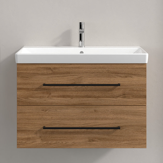 Villeroy and Boch Avento 800mm Wall-Hung Vanity Unit & Basin – Kansas Oak with Black Handle