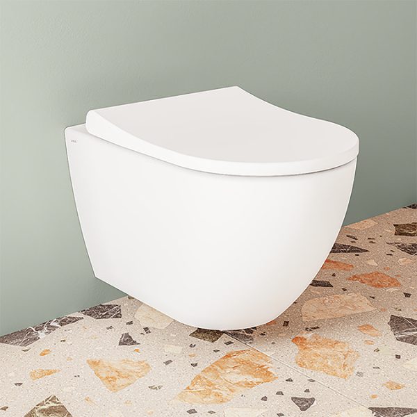 The VitrA Evi rimless toilet bundle combines functionality, style, and innovation for your modern bathroom. This comprehensive package includes a wall-hung pan, soft-close seat, wall-hung WC frame with cistern, and a round matt black flush plate. The Evi Round Wall Hung Rimless Toilet boasts a 540mm projection and features a rimless design, ensuring improved hygiene and easy cleaning. The soft-close lid prevents noisy slamming, adding convenience to your daily routine. The concealed wall-hung WC frame and cistern are meticulously designed for seamless integration, providing efficient water usage and a swift, quiet refill. Meanwhile, the robust frames create a sturdy foundation, ensuring long-lasting durability. The VitrA matt black flush plate, with its sleek rectangular shape, elegantly complements any bathroom decor.